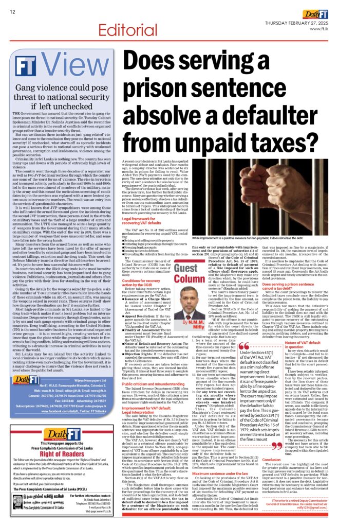 Sri Lanka confronts two pressing issues that threaten stability: 1) Escalating gang violence linked to drug trafficking and ex-military personnel, with authorities underestimating its potential to evolve into a national security crisis; and 2) Controversial tax enforcement, exemplified by a recent case where a director was jailed for VAT default despite outdated laws capping imprisonment at six months regardless of debt size.
