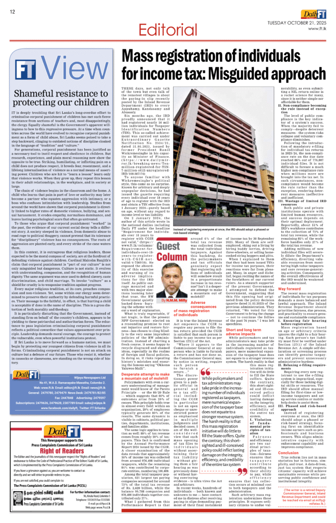 Sri Lanka’s recent initiative to register every adult for income tax is a mistaken and inefficient action. As someone who served in the Inland Revenue Department, I feel this approach undermines fairness, practicality, and the real purposes of a strong tax system.