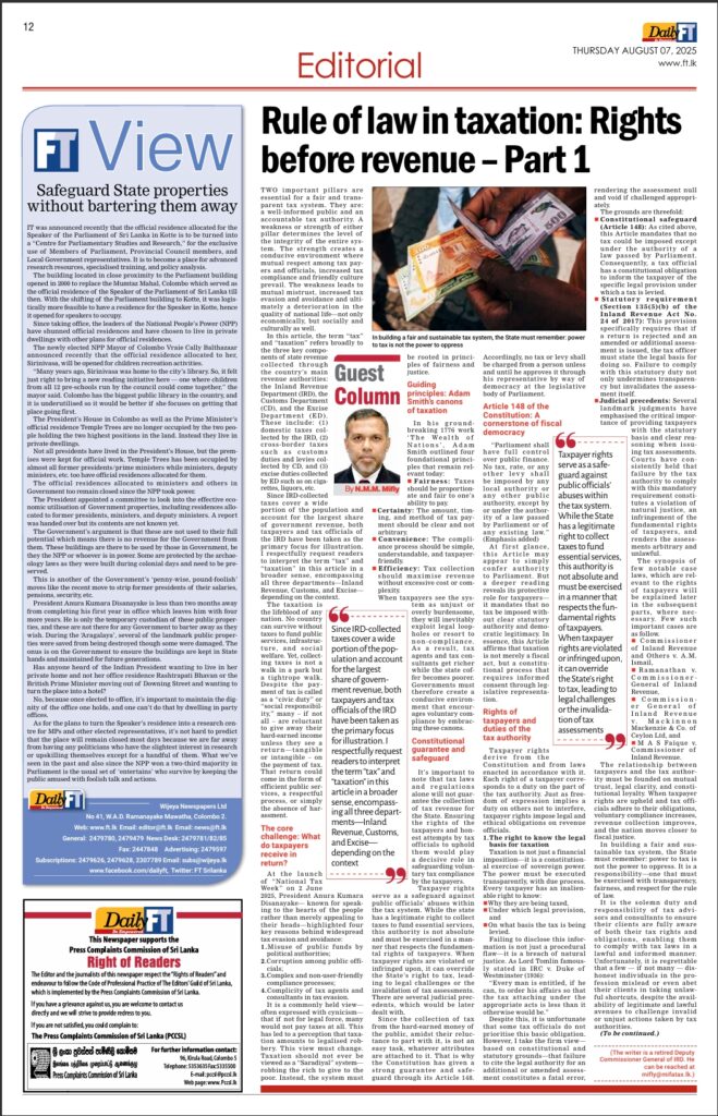 Taxation is the backbone of a functioning society—but it should never cross the line into oppression. In “Rule of Law in Taxation: Rights before Revenue,” I emphasize that the State’s power to tax is not a blank check; it must be exercised with respect for the fundamental rights of every taxpayer. Article 148 of the Constitution makes this clear: no tax can be imposed without parliamentary approval, anchoring taxation in the principles of democracy and fairness. When tax officials sidestep these protections or neglect to reveal the legal grounds for their actions, it’s more than an error—it’s a breach of justice that makes such acts unlawful and erodes public trust.