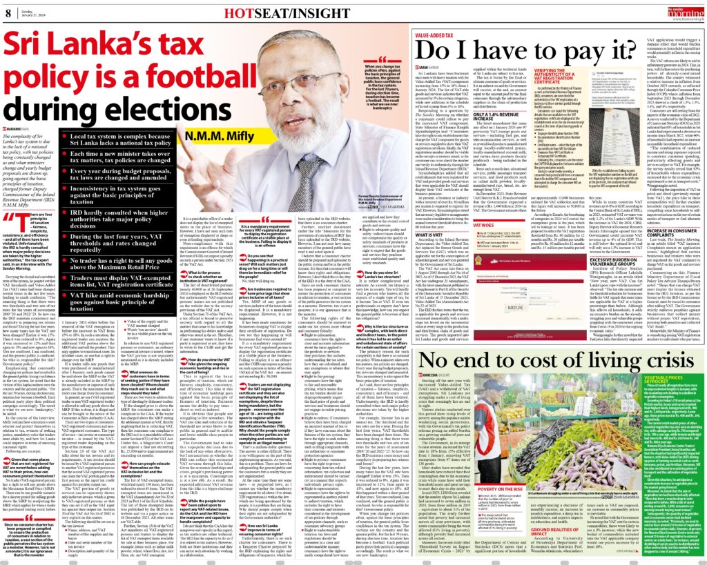 Sri Lanka’s tax system is plagued by political interference, with VAT rates changed 5 times since 2020 (now 18%), worsening inflation and poverty. Experts blame ad-hoc policies, weak enforcement (e.g., unregistered businesses charging VAT), and lack of consumer protections. As vegetable prices triple and 7 million fall into poverty, calls grow for a national tax policy to end this chaos.